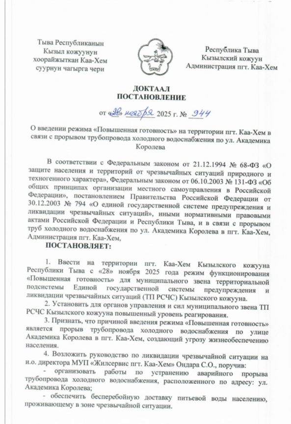 Постановление № 944 от 28.11.2025 г. "О введении режима "Повышенная готовность" на территории пгт. Каа-Хем в связи с прорывом трубопровода холодного водоснабжения по ул. Академика Королева.
