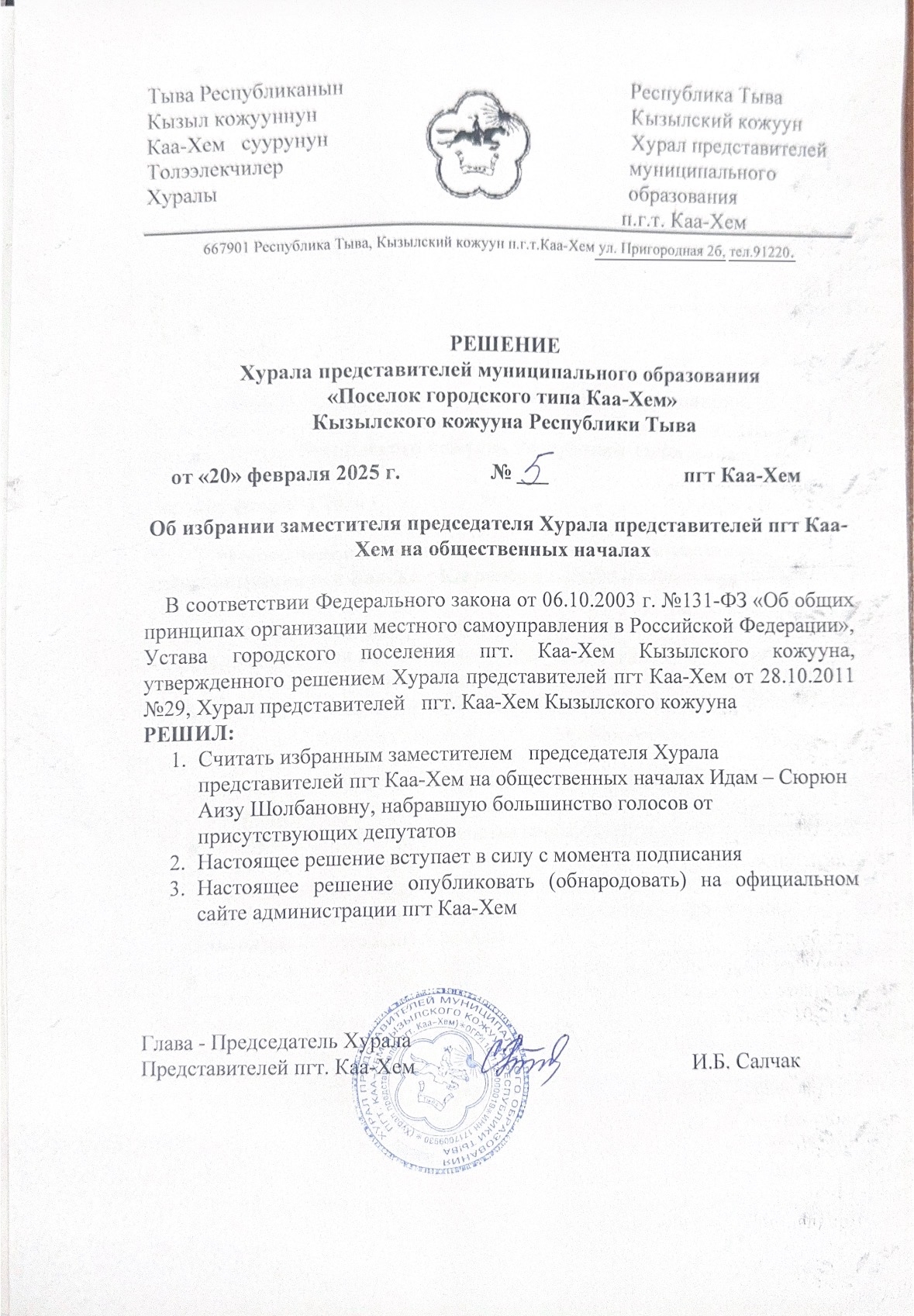 Решение Хурала представителей пгт Каа-Хем № 5 от 12.01.2023 г.