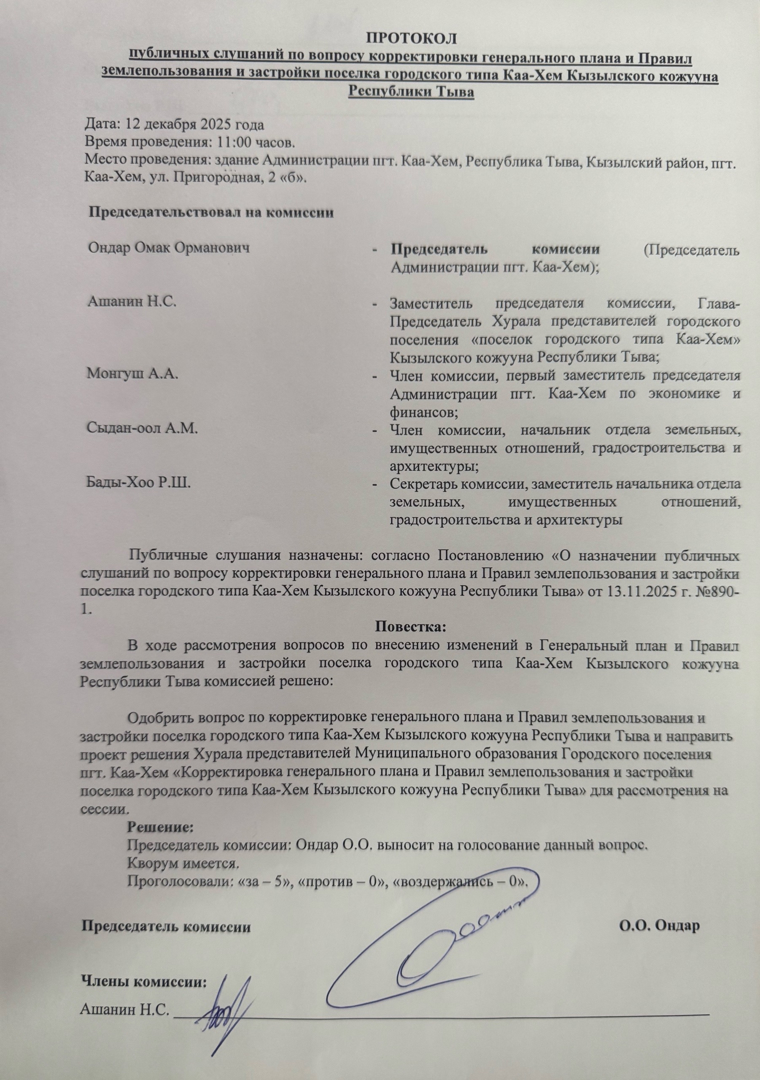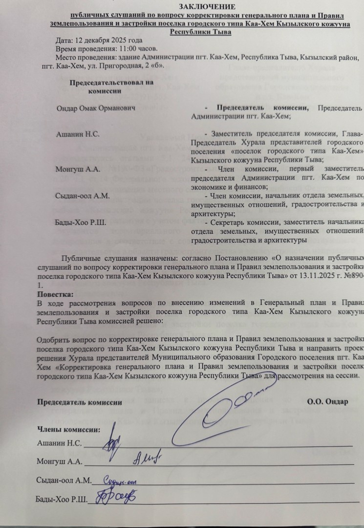 Постановление № 984 от 16.12.2025 г. "Об одобрении решения Хурала представителей МО городского поселения пгт. Каа-Хем "о корректировке генерального плана и Правил землепользования и застройки пгт. Каа-Хем Кызылского кожууна Республики Тыва.